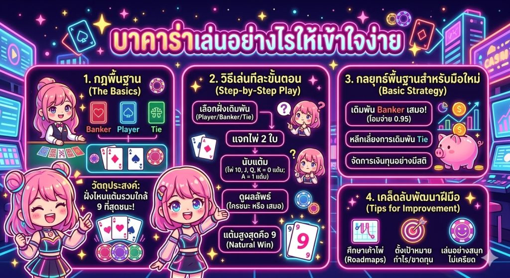 สำหรับผู้ที่เพิ่งเริ่มเล่นบาคาร่า ควรเริ่มต้นด้วยการเรียนรู้กติกาของเกมให้เข้าใจก่อน จากนั้นทดลองเล่นด้วยเงินเดิมพันเล็กน้อยเพื่อฝึกฝน